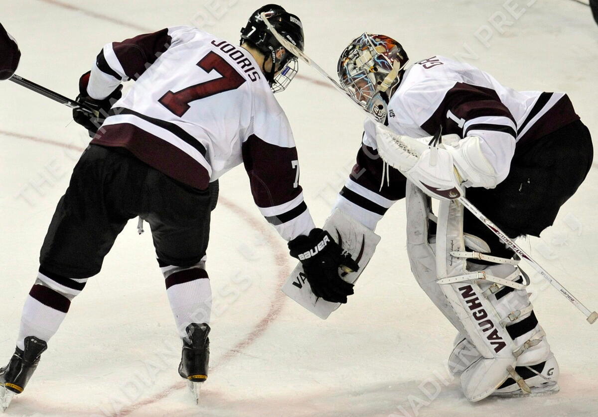 Union College's Josh Jooris, left, celebrates with goalie Troy Grosenick, right, at the end of an East regional semifinal game against Michigan State in the NCAA college hockey tournament in Bridgeport, Conn., Friday, March 23, 2012. The Calgary Flames have signed centre Jooris to a two year, two-way entry level deal. THE CANADIAN PRESS/AP-Jessica Hill