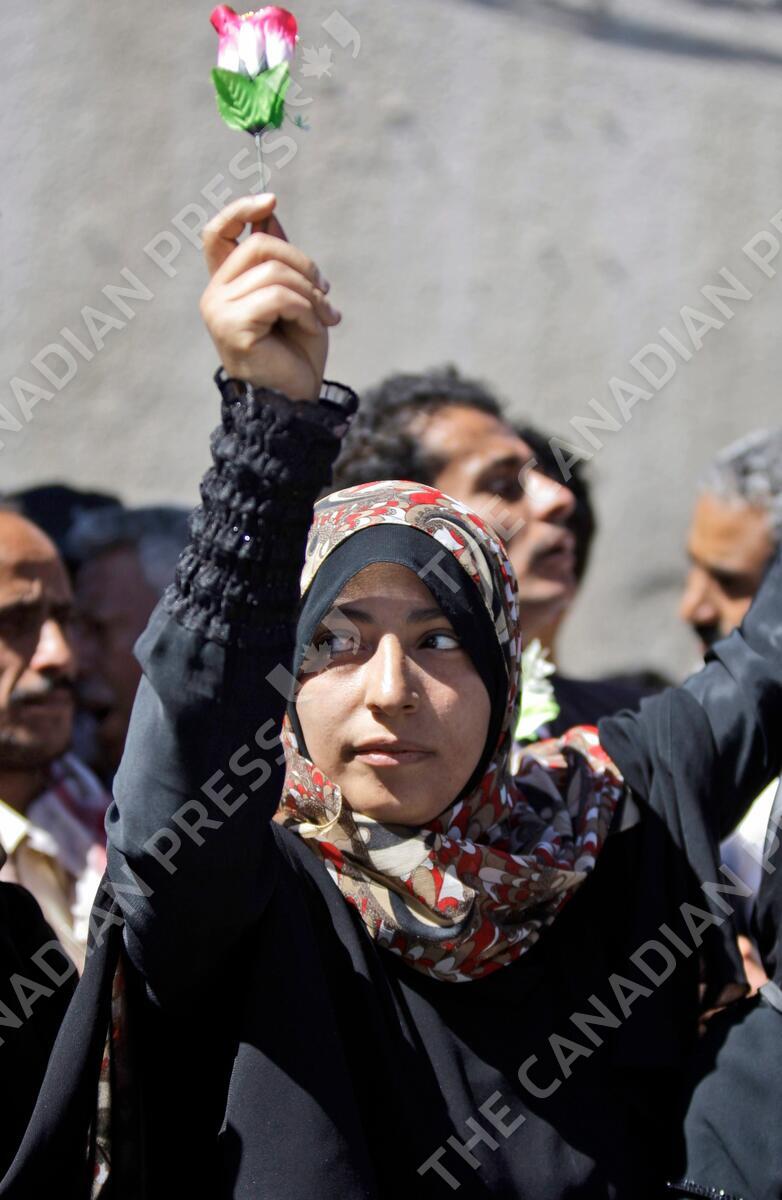FILE - In this Jan. 26, 2011 file photo, Yemeni activist Tawakul Karman, who was jailed for leading protests at the weekend, holds a rose during an anti-government protest in Sanaa, Yemen. Liberian President Ellen Johnson Sirleaf, Liberian activist Leymah Gbowee and Tawakkul Karman of Yemen have won the 2011 Nobel Peace Prize, the Norwegian Nobel Committee announced Friday, Oct. 7, 2011. (AP Photo/Hani Mohammed, File)