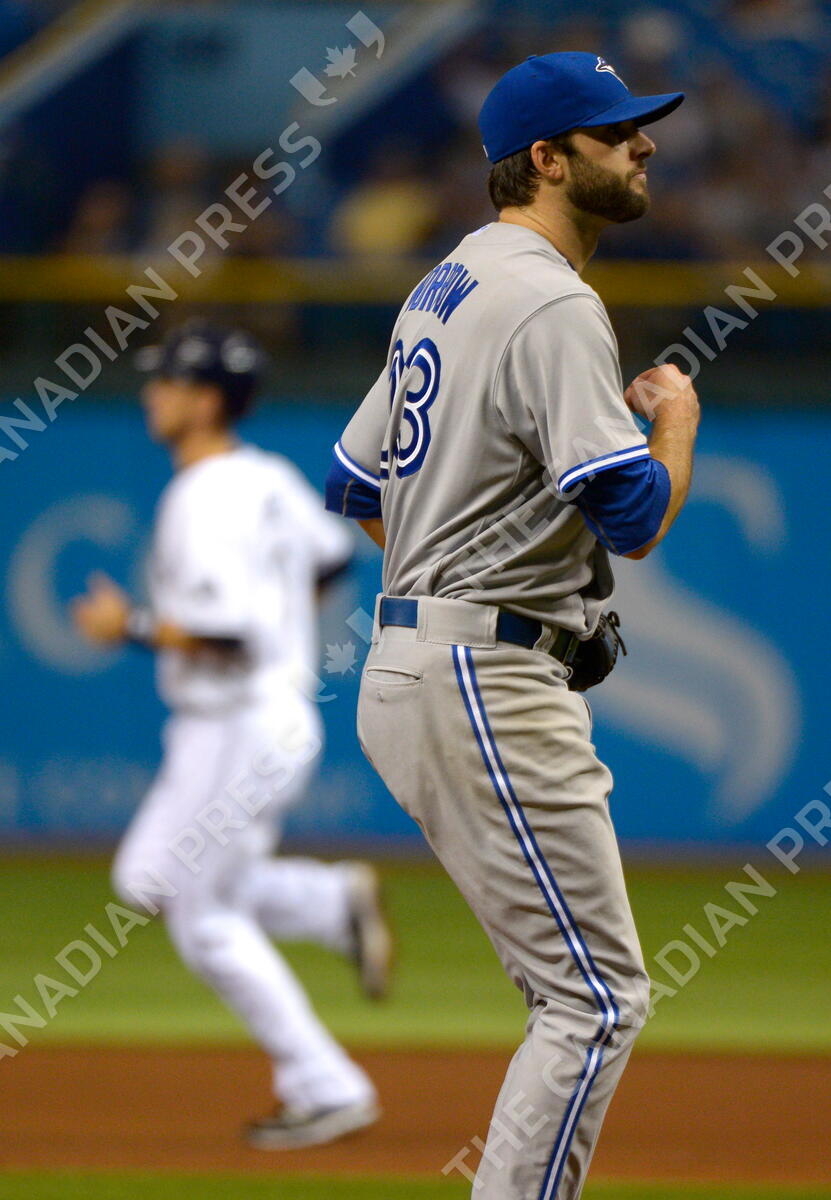 Toronto Blue Jays starting pitcher Brandon Morrow, right, reacts after walking in a run as Tampa Bay Rays' Ben Zobrist heads to second base during the first inning of a baseball game in St. Petersburg, Fla., Saturday, Sept. 22, 2012.(AP Photo/Phelan M. Ebenhack)