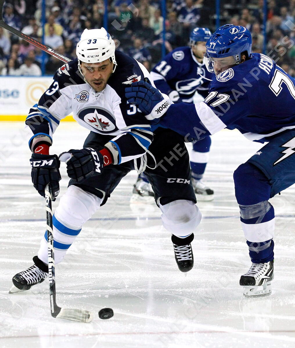 Winnipeg Jets' Dustin Byfuglien, left, skates past Tampa Bay Lightning's Victor Hedman, of Sweden, during the third period of an NHL hockey game Thursday, Feb. 2, 2012, in Tampa, Fla. Byfuglien will stand trial on charges including operating a boat while impaired, after his lawyer and the prosecution failed to reach a plea deal Thursday.THE CANADIAN PRESS/AP-Mike Carlson