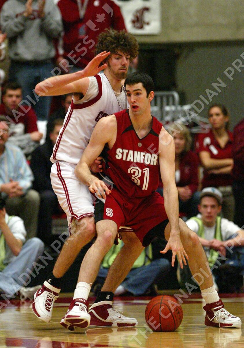 Washington State center Robbie Cowgill defends Stanford forward Taj Finger(31) in the second half on Thursday, Feb. 8, 2007, in a college basketball game in Pullman, Wash. Washington State won the game, 45-58.(AP Photo/Kody Whiteaker)