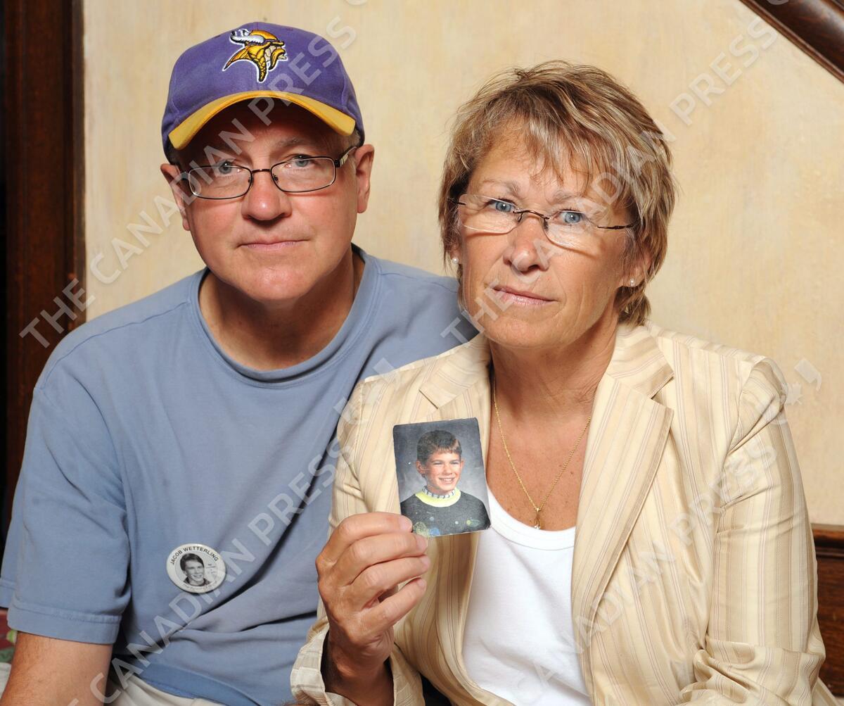 FILE - In this Aug. 28, 2009, file photo, Patty and Jerry Wetterling show a photo of their son Jacob Wetterling, who was abducted in October of 1989 in St. Joseph, Minn and is still missing, in Minneapolis. Federal authorities said Thursday, Oct. 29, 2015, Daniel James Heinrich, a Minnesota man charged with child pornography after a search of his home found pictures of naked boys is also a "person of interest" in the disappearance of Jacob Wetterling, whose 1989 abduction led his parents to launch a national center to prevent child exploitation. (AP Photo/Craig Lassig, File)