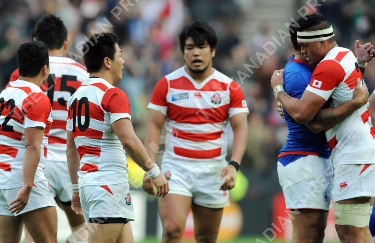 Japan and Samoa players at the end of the Rugby World Cup Pool B match between Samoa and Japan at stadium:mk, Milton Keynes, England, Saturday, Oct. 3, 2015. Japan won the match 5-26. (AP Photo/Rui Vieira)