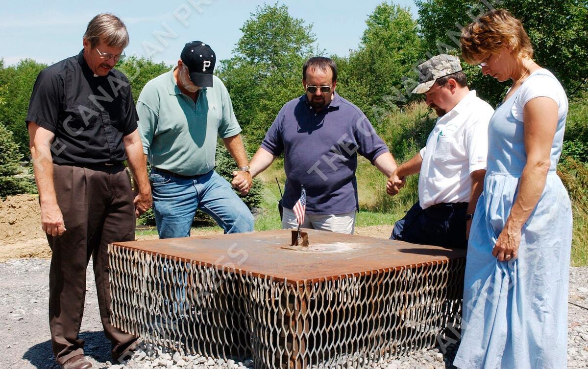 ** FILE ** Lori and Bill Arnold, right, pray with Rev. Barry Ritenour, center, and Rev. Joseph Beer, left, along with Ron Hilleman, second from left, in this July 20, 2003, file photo at the site in Somerset, Pa., where Hilleman and eight other miners were rescued after being trapped for three days in July 2002. Bill and Lori Arnold have always been caretakers of their dairy farm. Now, they say they're caretakers of a miracle, tending the site where nine miners were rescued five years ago after spending 77 hours trapped in the Quecreek Mine below the Arnolds' farm.(AP Photo/Keith Srakocic)