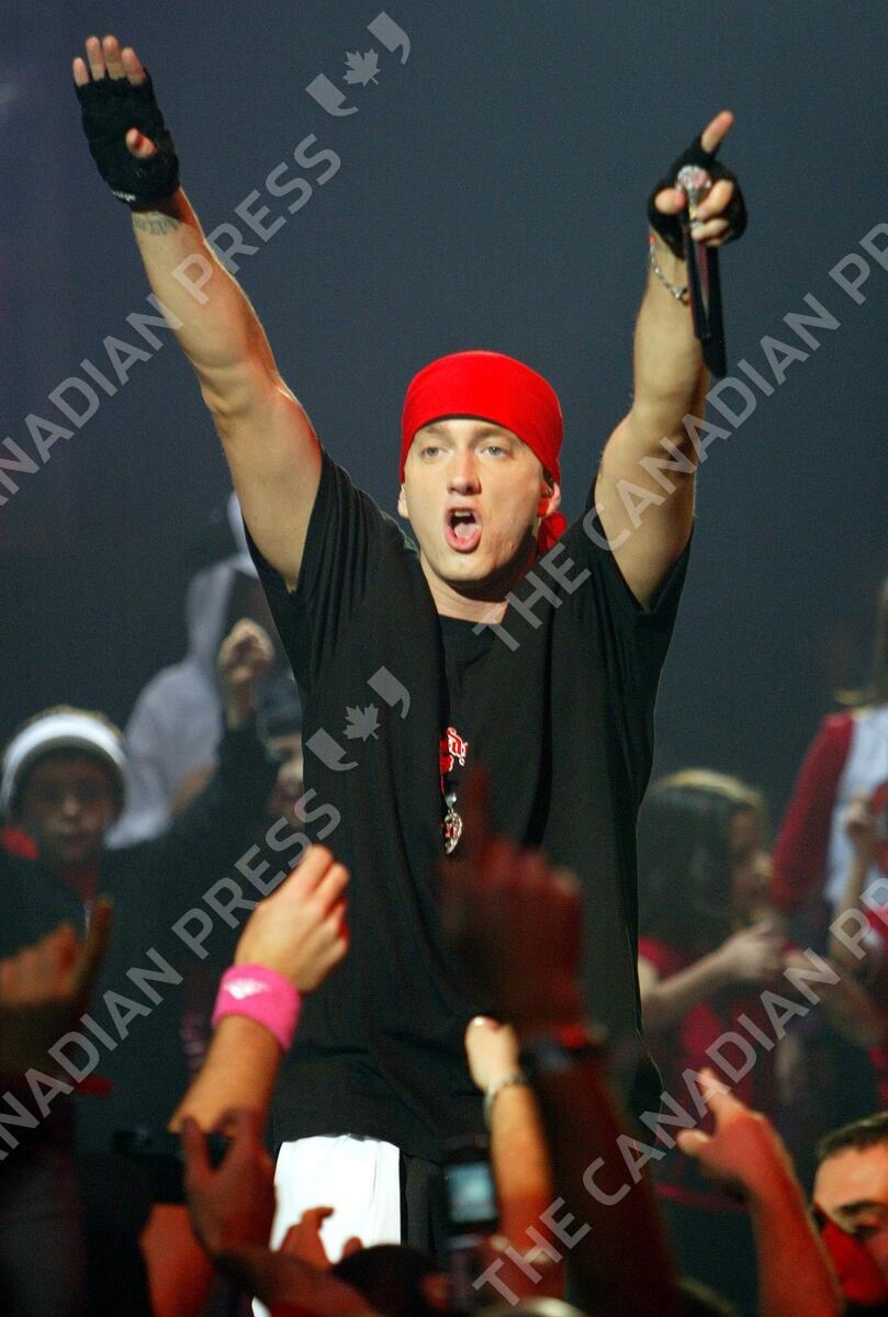 ** FILE **Rapper Eminem performs at the MTV Europe Music Awards 2004 ceremony in Rome, seen in this Thursday, Nov. 18, 2004, file photo. Eminem told a radio show, in Detroit, Tuesday, Dec. 6, 2005, that he is back together with his ex-wife, and may remarry. Eminem, born Marshall Mathers III, went through an ugly divorce and custody battle over his young daughter with Kimberly Mathers. They had married in 1999, and their divorce was finalized in 2001. During the interview, he referred to Kimberly Mathers, 30, as "my wife Kim." (AP Photo/Andrew Medichini)