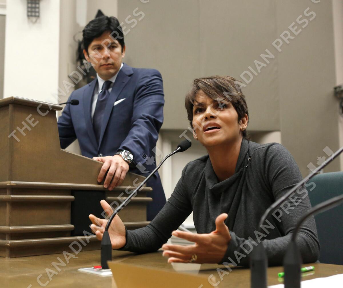 FILE - In this Aug. 13, 2013, file photo, actress Halle Berry urges lawmakers to support a bill that would limit the ability of paparazzi to photograph children of celebrities and public figures, at the Capitol in Sacramento, Calif. The bill, by state Sen. Kevin de Leon, D-Los Angeles, left, was approved by the Legislature and signed by Gov. Jerry Brown, is one of the more than 800 new laws to take effect Jan. 1. (AP Photo/Rich Pedroncelli, File)