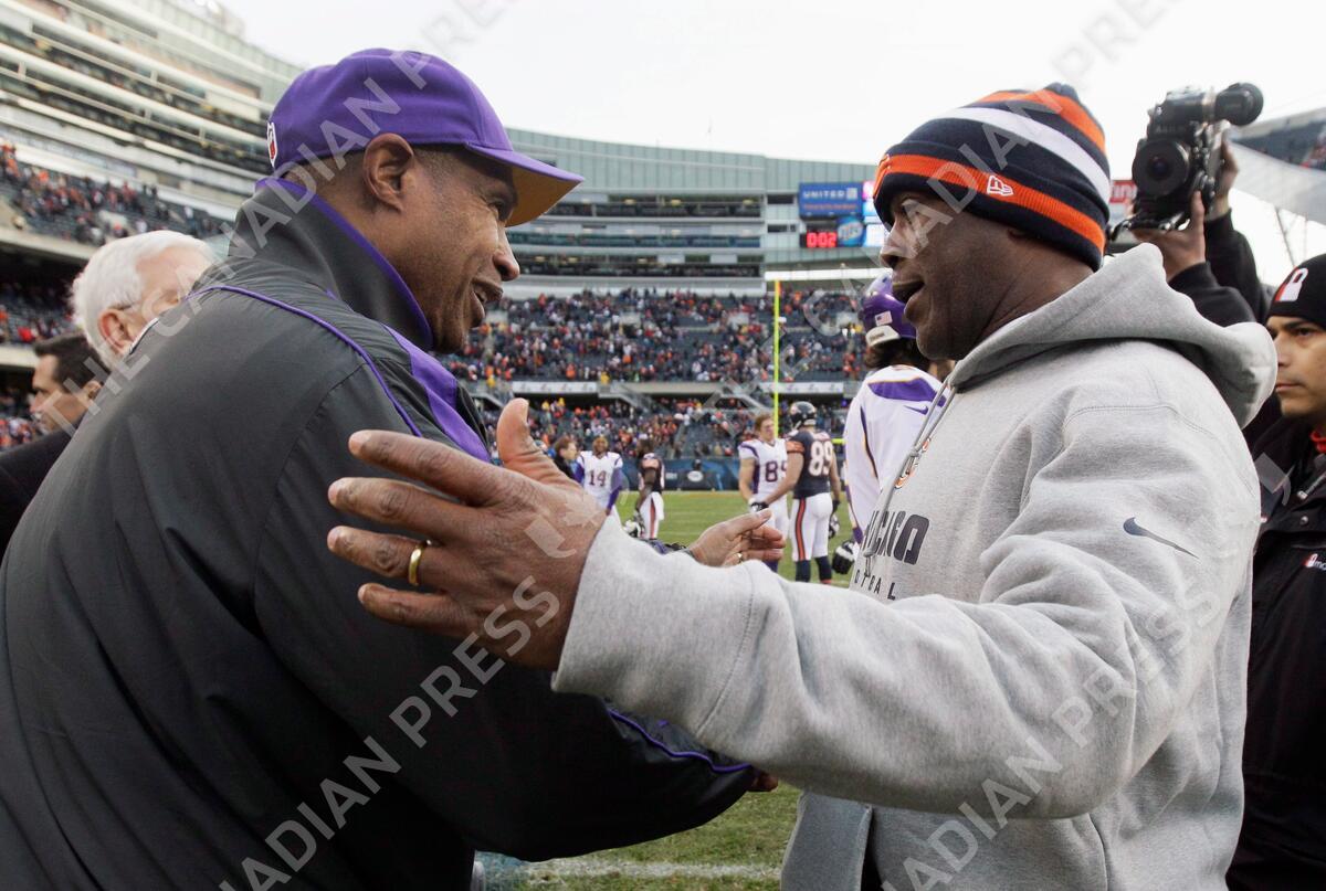 FILE - In this Nov. 25, 2012, file photo, Chicago Bears coach Lovie Smith, right, is greeted by Minnesota Vikings coach Leslie Frazier after the Bears' 28-10 win in an NFL football game in Chicago. A person familiar with the negotiations says former Bears coach Smith has reached an agreement to coach the Tampa Bay Buccaneers. Speaking to The Associated Press on Wednesday night, Jan. 1, 2014, on the condition of anonymity because an official announcement hasn't been made, the person also says former Vikings coach Frazier will be the Buccaneers' defensive coordinator. (AP Photo/Nam Y. Huh, File)