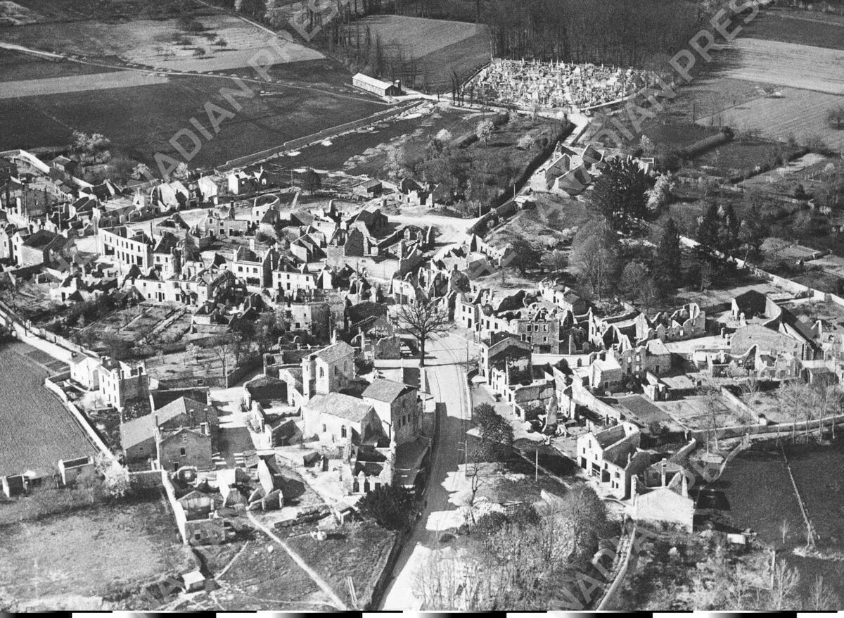 FILE - In this Jan. 1, 1953 b/w file picture, an aerial view of the destroyed Oradour-sur-Glane, in France is visible . German authorities have charged an 88-year-old former member of an SS armored division with 25 counts of murder for allegedly taking part in the largest massacre in Nazi-occupied France. The Cologne state court said Wednesday Jan. 8, 2014 that Werner C., whose last name wasn't given in accordance with German privacy laws, was also charged with hundreds of counts of accessory to murder in connection with the slaughter in Oradour-sur-Glane, 25 kilometers (15 miles) northwest of Limoges, in 1944. In total 642 men, women and children were killed in reprisal for the French Resistance's kidnapping of a German soldier. (AP Photo,File)