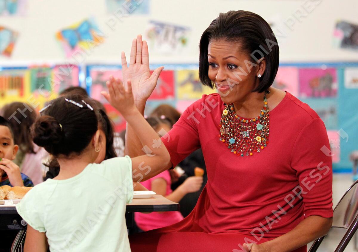 FILE - In this May 19, 2010 file photo, First lady Michelle Obama sits down to eat with students during a visit to New Hampshire Elementary School with Mexican first lady Margarita Zavala, in Silver Spring, MD. The nation’s first lady turns 50 on Friday and, by her own account, feels more relaxed now that President Barack Obama’s days as a candidate for elected office are over. (AP Photo/Pablo Martinez Monsivais)