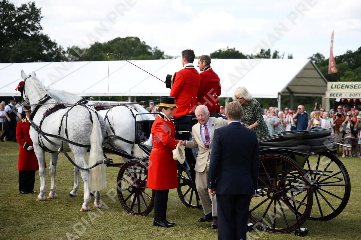 July 26, 2023, United Kingdom, Norfolk, Sandringham: Britain's King Charles III and Britain's Queen Camilla arrive by horse carriage for a visit of the Sandringham Flower Show, in Sandrigham, north west England, on July 26, 2023. (Credit Image: å© Daniel Leal/Avalon via ZUMA Press)