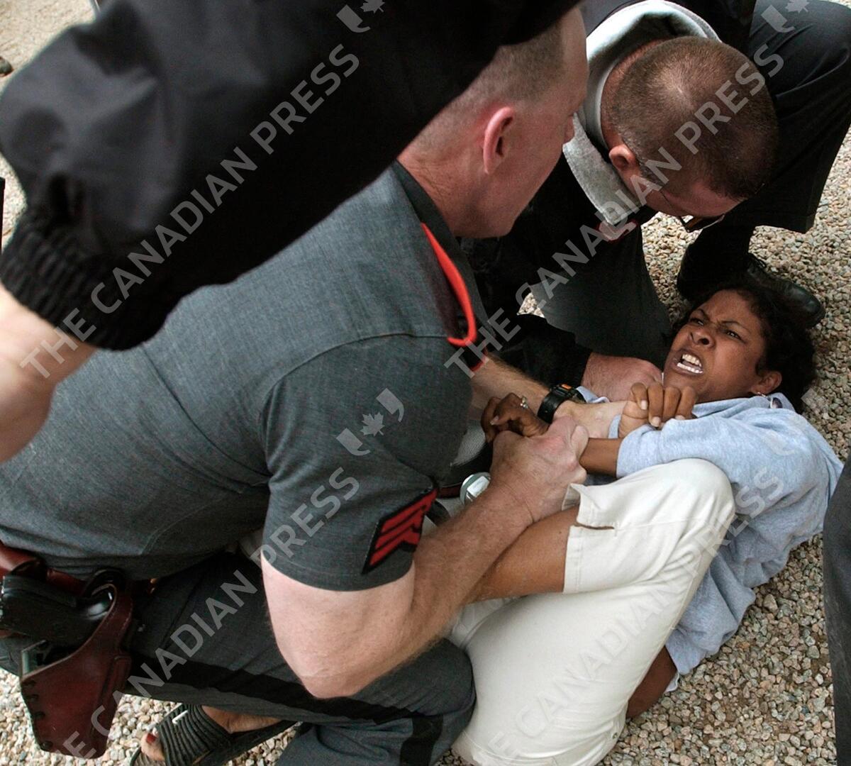 ** FILE ** Rhode Island State Police officers restrain a Narragansett tribe member following a raid on the new Narragansett Smoke Shop located on tribal land in Charlestown, R.I., as seen in a file photo from Monday, July 14, 2003. Rhode Island Prosecutors and the lawyers for seven tribe members arrested in the raid argued in court during the second week of July 2007 how much the issues of history race can be introduced at the criminal trail scheduled for fall 2007. (AP Photo/Victoria Arocho)