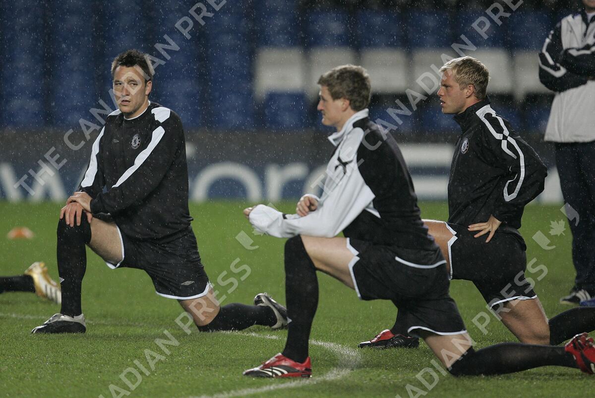 Chelsea's captain John Terry stretches at Chelsea's Stamford bridge ground in west London late Monday Dec. 5, 2005. Chelsea play Liverpool in their UEFA Champions League soccer match Tuesday Dec. 6, both have qualified for the next stage of the competition . (AP Photo/Alastair Grant)
