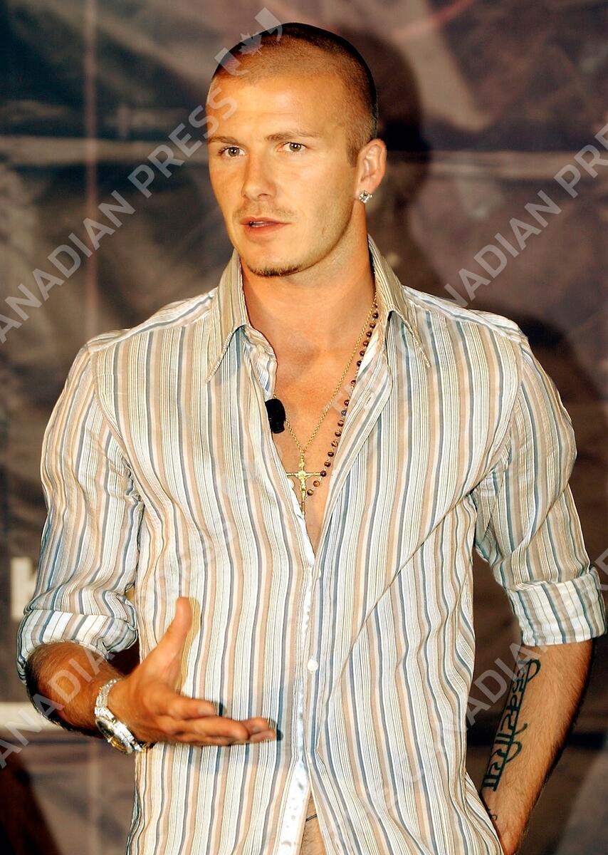 ** FOR USE WITH AP LIFESTYLES ** ** FILE ** English soccer star David Beckham gives a news conference to show his new football skill DVD in Madrid, Spain, Oct.1, 2004. (AP File Photo/Fernando Llano)