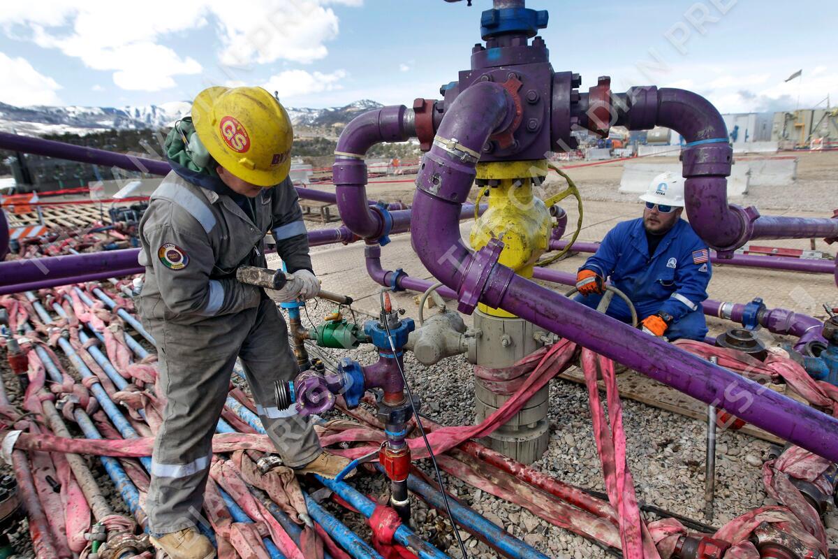 FILE - In this March 29, 2013 file photo, workers tend to a well head during a hydraulic fracturing operation at an Encana Oil & Gas (USA) Inc. gas well outside Rifle, in western Colorado. Wyoming, New Mexico and other states will lose more than $400 million in mineral payments over the next decade under a budget deal nearing final approval in the Senate. A provision in the budget deal preserves a 2 percent fee charged by the government on royalties from energy companies that purchase oil and gas leases on federal land. The fee effectively set a 51-49 split, favoring the federal government, on energy royalties. The government last year paid $2.1 billion to 35 states under the program, with the largest payments going to five Western states: Wyoming, New Mexico, Utah, Colorado and California. (AP Photo/Brennan Linsley, File)