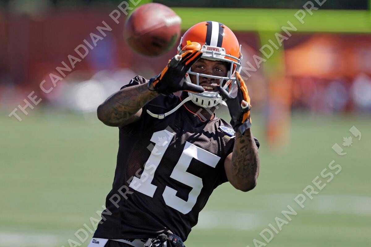 FILE - In this July 25, 2013, file phot, Cleveland Browns wide receiver Davone Bess catches a pss during NFL football training camp at the team's training facility in Berea, Ohio. The Browns say they are aware of potentially incriminating photos posted by wide receiver Davone Bess on his Twitter account. Bess, who missed Cleveland's final two games for personal reasons, posted a photo on Thursday, Jan. 15, 2014, of a small package containing what appears to be marijuana. (AP Photo/Mark Duncan)