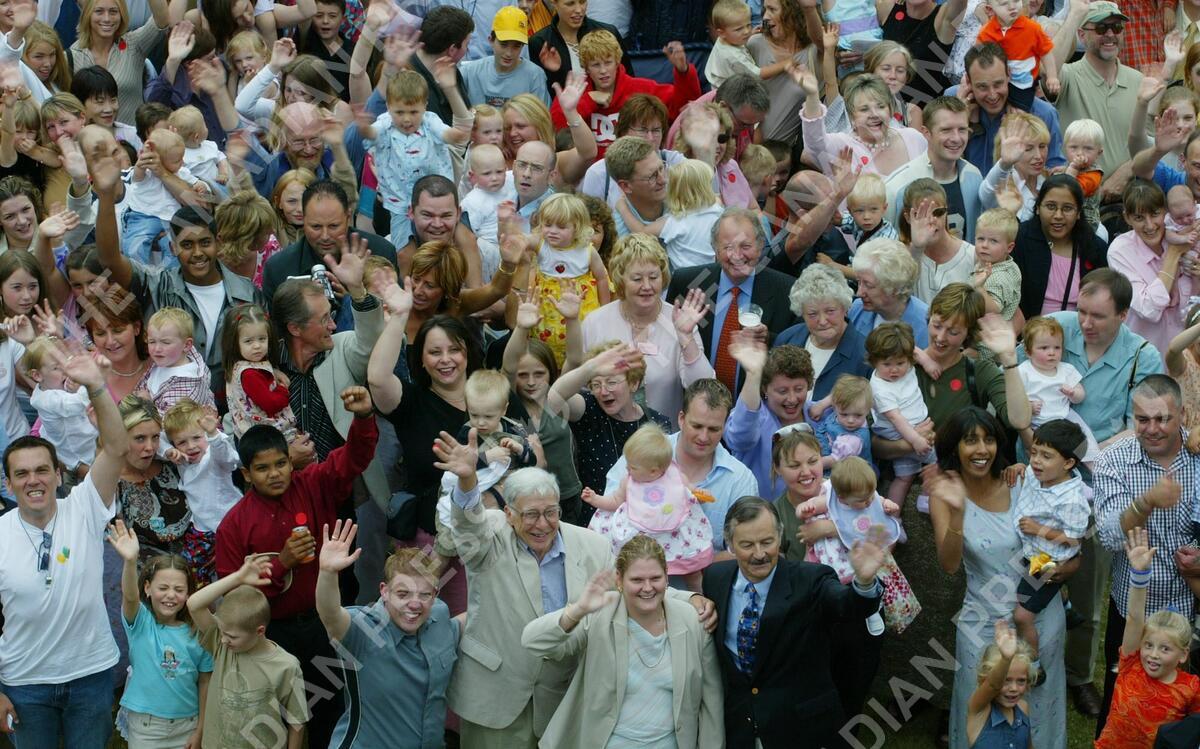 **FILE**Louise Brown, front center, with Alastair Macdonald front fourth left, the first in vitro fertilized female and male babies born, attend the 25th anniversary reunion at the Bourn Hall Clinic near Cambridge, England in this file photo from July 26, 2003. Brown, who was the world's first "test-tube" baby, has given birth to her first child. Cameron John Mullinder was born Dec. 21 in the western English city of Bristol, reports said. (AP Photo/Alastair Grant-File)