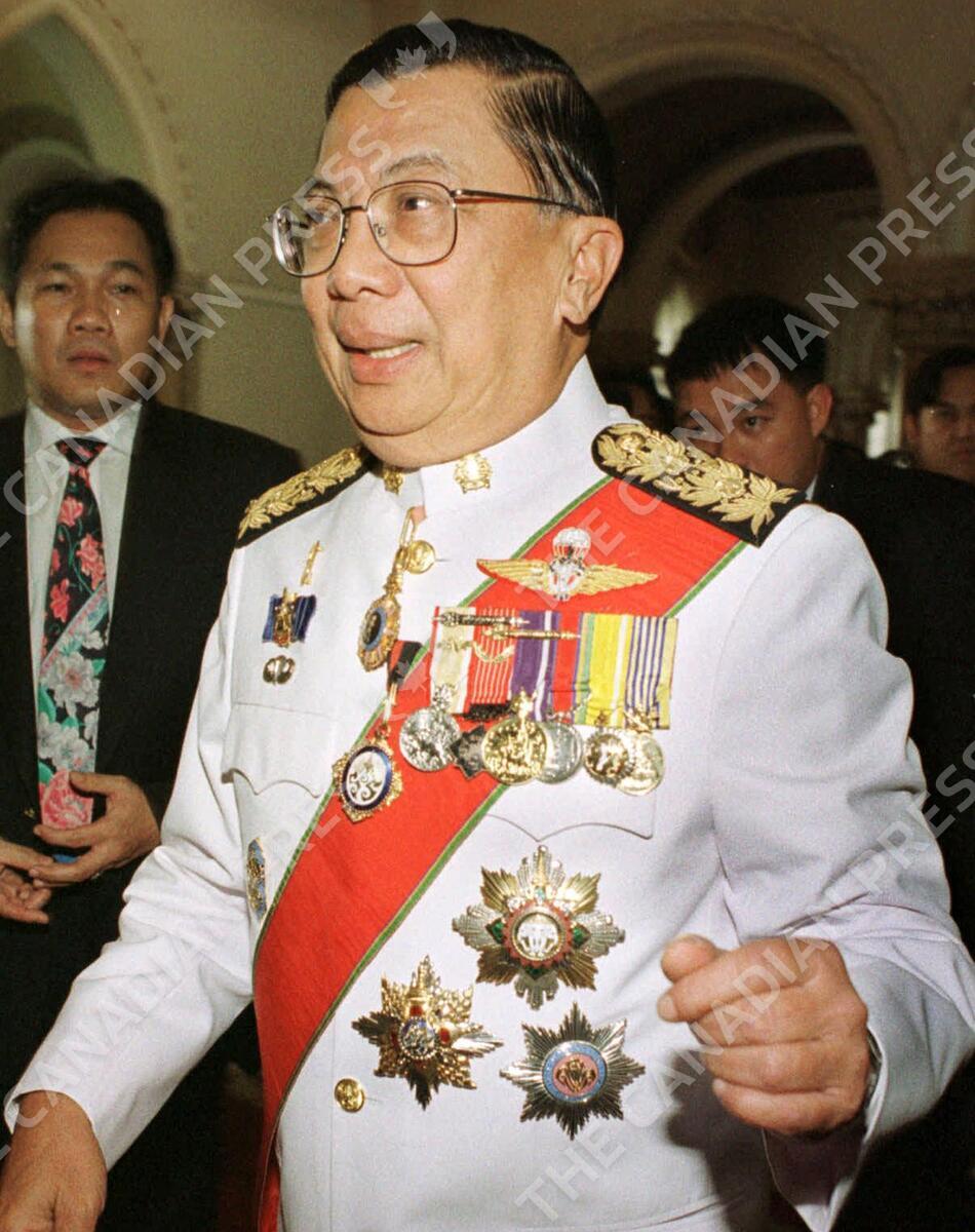 ** FILE ** Then Thai Prime Minister Chavalit Yongchaiyudh, front right, leaves the government house in Bangkok in this Friday, Oct. 24,1997 file photo. Security for Thai Prime Minister Surayud Chulanont has been stepped up, the military said Thursday, Jan.4, 2007, as political bickering escalated over who was to blame for New Year's bombings that killed three people. A former prime minister, Chavalit Yongchaiyudh, responding to insinuations that he may be linked to the eight small blasts in and around the Thai capital of Bangkok on Dec. 31, 2006, accused the military of mishandling the case, which he described as an inside job. (AP Photo/Thaksina Khaikaew, File)