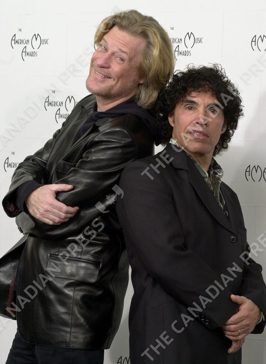 FILE -- Daryl Hall, left, and John Oates, of the 80s pop group Hall & Oates, pose after presenting an award at the 30th annual American Music Awards, Monday, Jan. 13, 2003, in Los Angeles. As the story goes, Daryl Hall and John Oates wouldn't have met if it wasn't for a huge fight. Both were in separate bands when they crossed paths at a citywide soul revue in the late 1960s at Philadelphia's Adelphi Ballroom. A riot broke out in the middle of the show, and most of the bands fled once knives and guns appeared.