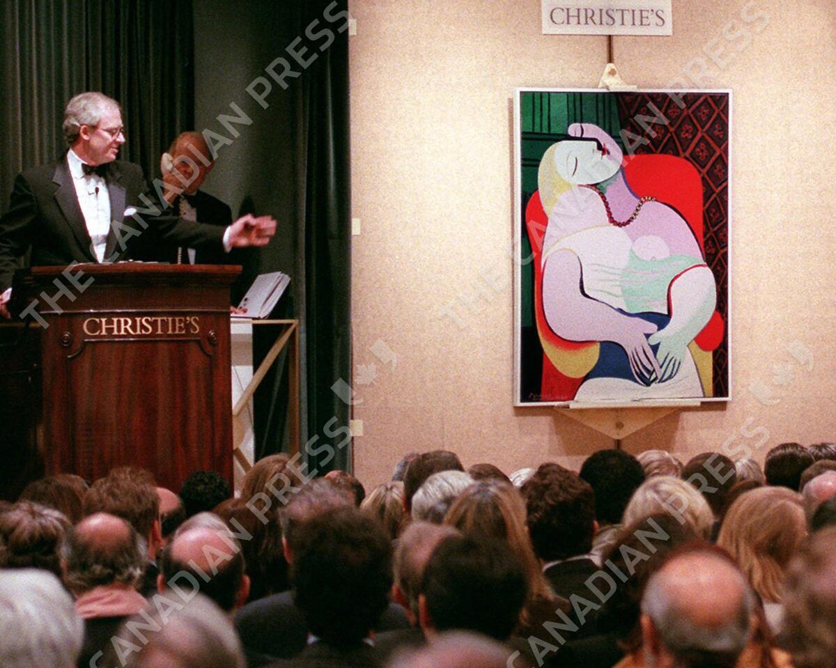 **FILE** Picasso's "The Dream" is auctioned by auctioneer Christopher Burge on Nov. 10, 1997, at Christie's auction house in New York. Casino mogul Steve Wynn, who now owns the painting, lost $139 million but got to keep one of his favorites when he poked a hole in the Picasso last October. Now, he says in a telephone interview Thursday, Nov. 9, 2006, it will cost Wynn $85,000 to repair the damage to the art work.(AP Photo/Emile Wamsteker)