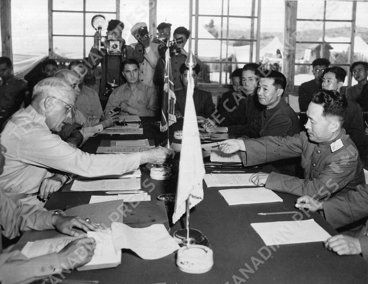 Maj. Gen. Blackshear M. Bryan, left, exchanges credentials with Communist Lt. Gen. Lee Sang Cho at the opening session of the Military Armistice Commission at the Panmunjom Conference House on July 28, 1953. At Lee's right is Chinese Gen. Ting Kuo Jo, and next to him is Chinese Gen. Tsai Cheng Wen. (AP Photo)