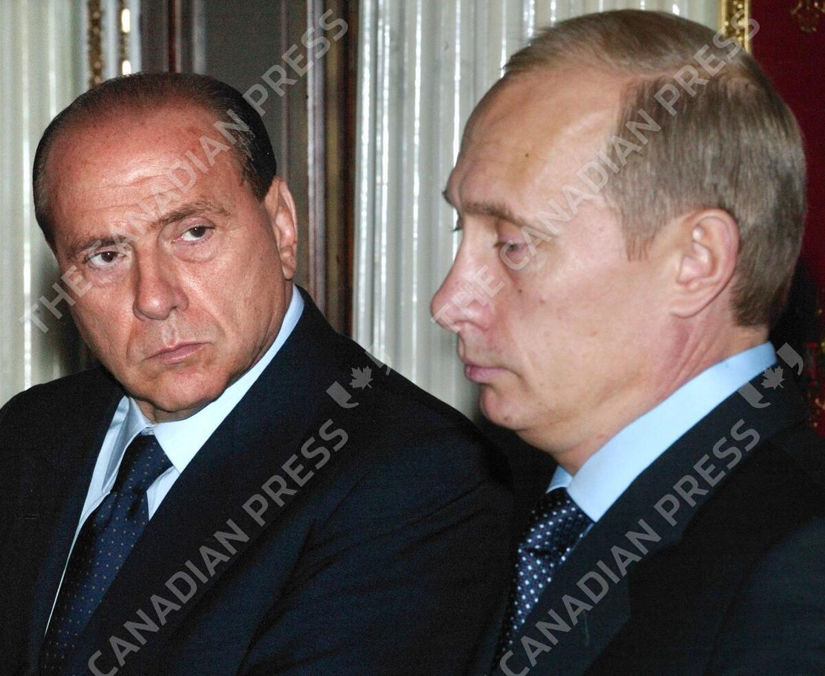 President Vladimir Putin, right, and Italian Prime Minister Silvio Berlusconi seen at a joint news conference after talks at the Kremlin in Moscow, Wednesday, Oct. 16, 2002. Silvio Berlusconi, who arrived in Moscow Wednesday for a one-day visit, began talks with Vladimir Putin that were expected to focus on Iraq and Italy's strong backing of tough U.S. action against Baghdad. (AP Photo/Yuri Kochetkov, Pool)
