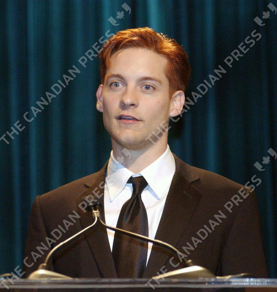 Actor Tobey Maguire, who will star in the motion picture "Seabiscuit," about the famous racehorse, introduces the Horse of the Year Award at the 32nd Annual ECLIPSE Awards show, in this Jan. 27, 2003 photo, in Beverly Hills, Calif. Maguire has been yo-yo dieting lately, but it's work-related. He bulked up to star as the webslinging crimefighter in last year's ``Spider-Man,'' then trimmed down to play a jockey in the upcoming ``Seabiscuit,'' then had to get buff again for next summer's ``Spider-Man 2.'' ``Coming off of 'Seabiscuit' and going into 'Spider-Man,' it's different physically,'' the 27-year-old actor told MTV News. (AP Photo/Rene Macura)