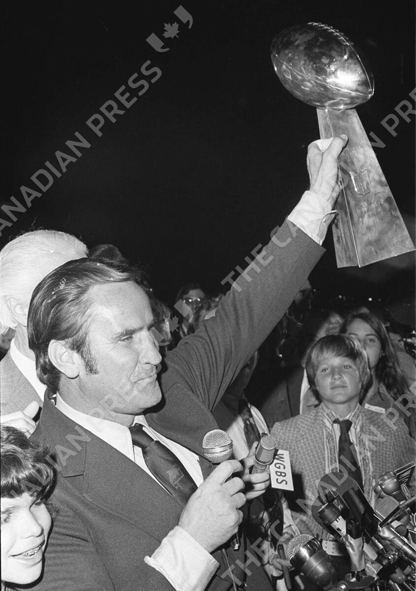 Miami Dolphins coach Don Shula waves the Super Bowl trophy for a crowd for of some 2,000 fans as the team arrived in Miami after winning the Super Bowl, January 15, 1973. Shula's son David looks on at right. No team went undefeated before them, and no one has done it since. The 1972 Miami Dolphins, the NFL's only unbeaten team, celebrates 30 years of perfection.(AP Photo/file)