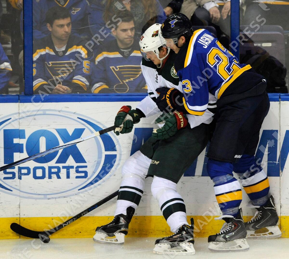 St. Louis Blues' Dimitrij Jaskin (23), of Russia, battles for the puck with Minnesota Wild's Jonas Brodin, left, of Sweden, during the third period of an NHL hockey game, Thursday, Dec. 31, 2015, in St. Louis. (AP Photo/Bill Boyce)