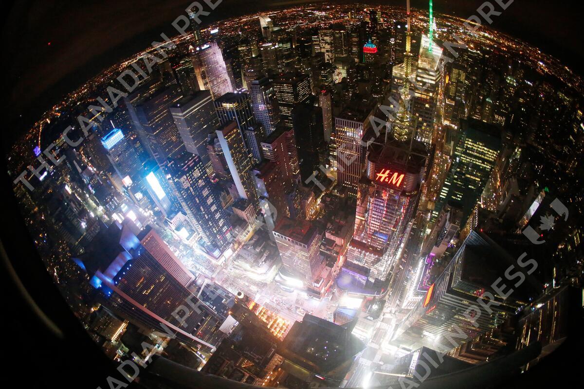 New York's Times Square glows during New Year's Eve celebrations seen from a New York Police helicopter patrolling the city, Thursday, Dec. 31, 2015, in New York. (AP Photo/Julio Cortez)