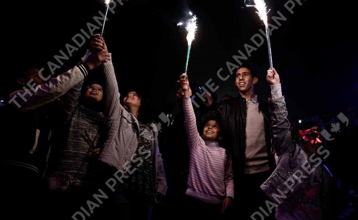 An Egyptian family lights fireworks mark New Year's Eve at the Giza Pyramids near Cairo, Egypt at midnight on Friday, Jan. 1, 2016. (AP Photo/Maya Alleruzzo)