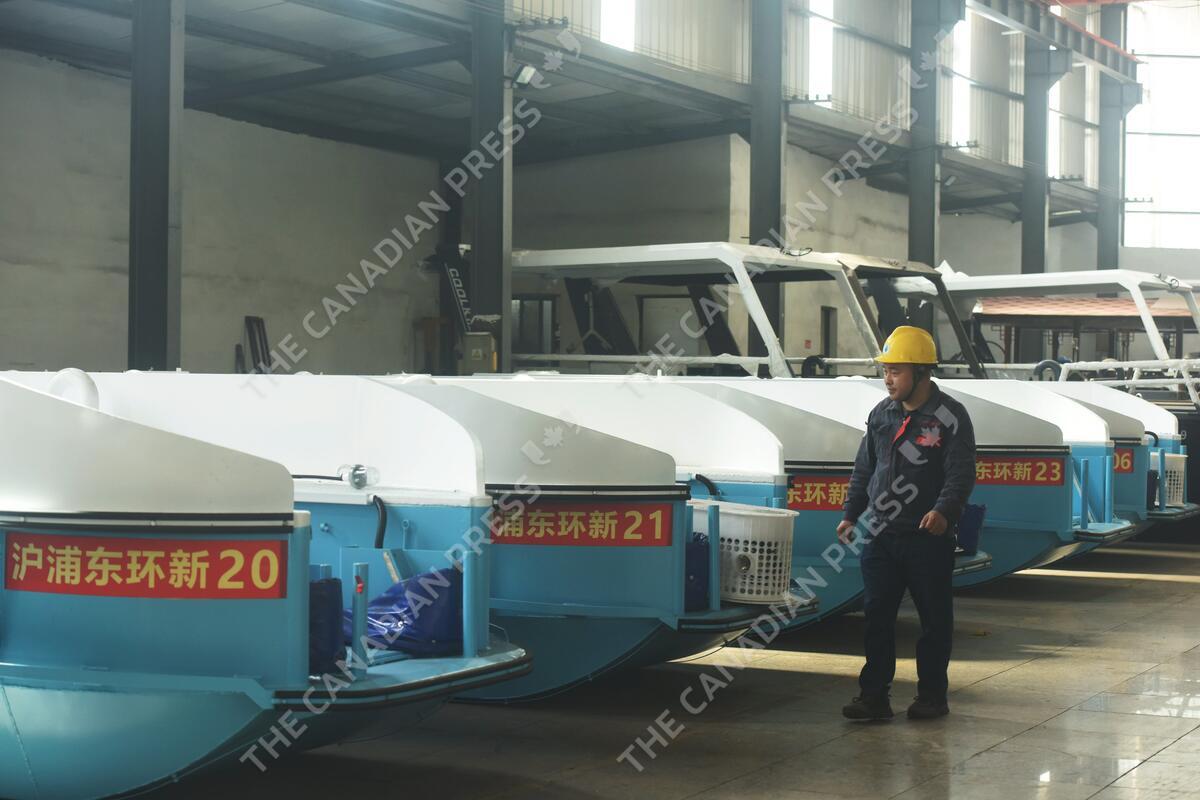 March 27, 2024, Hangzhou, Zhejiang, China: HANGZHOU, CHINA - MARCH 27, 2024 - A worker is inspecting the self-developed water surface cleaning long arm environmental protection ship at the factory building of a shipping company to ensure that the production of ships meet the needs of domestic lakes and reservoirs of water surface environmental cleaning in Hangzhou, Zhejiang province, China, March 27, 2024. Data released by the National Bureau of Statistics on the same day showed that from January to February 2024, the total profit of industrial enterprises above designated size across the country reached 914.06 billion yuan, an increase of 10.2% year-on-year. (Credit Image: © Cfoto/DDP via ZUMA Press) *** Local Caption *** 21721971