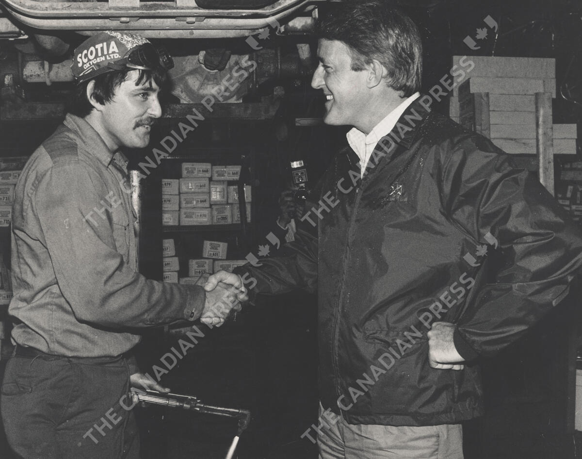 Brian Mulroney, campaigning in Westville, N.S., shakes hand with Joe DeCoste of New Glasgow, N.S., Westville, N.S., Friday, July 22, 1983. THE CANADIAN PRESS/Jann Van Horne