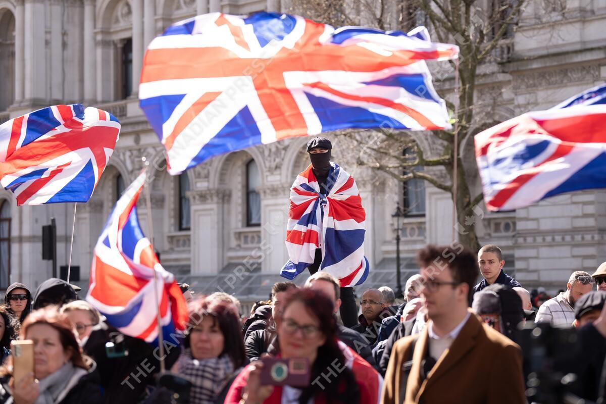 People take part in a 'Rally for British Culture' protest, organised by Turning Point UK, at the Cenotaph in Whitehall, London. Picture date: Saturday March 23, 2024.