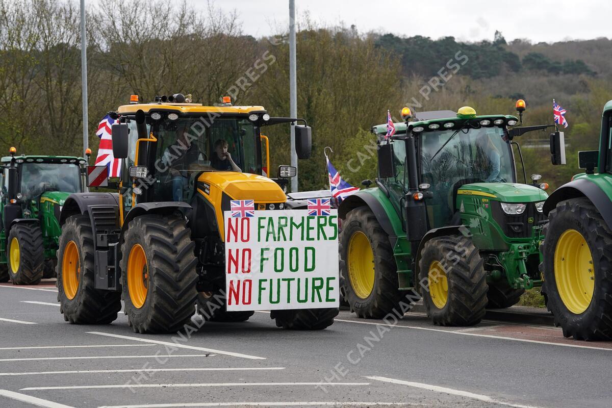RETRANSMITTING DATE CORRECTED A convoy of farmers in tractors gather on the A20, near Wrotham, in Kent, before heading to London to join a protest in Westminster raising awareness of the difficulties for the British farming industry. Picture date: Monday March 25, 2024.