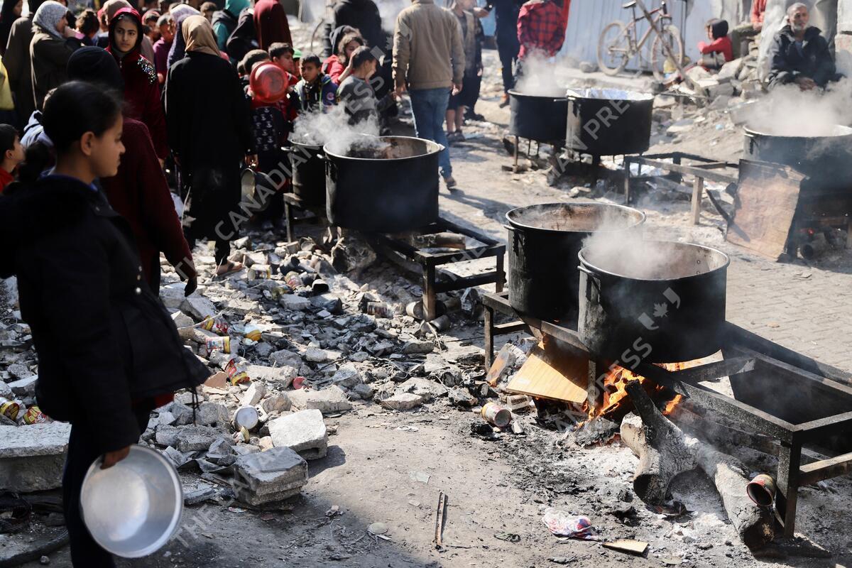 GAZA, Feb. 28, 2024 People wait to receive cooked food at a refugee camp in northern Gaza Strip, Feb. 27, 2024. The permanent observer of the State of Palestine to the United Nations, Riyad Mansour, on Tuesday told the Security Council that Gaza is currently experiencing a famine, which worsens daily due to the ongoing ''criminal aggression'' by Israel.. ''We must stop for a moment and consider what this truly means,'' Mansour addressed the Security Council meeting on the protection of civilians in armed conflicts. (Credit Image: å© Mohammed Ali/Xinhua via ZUMA Press)