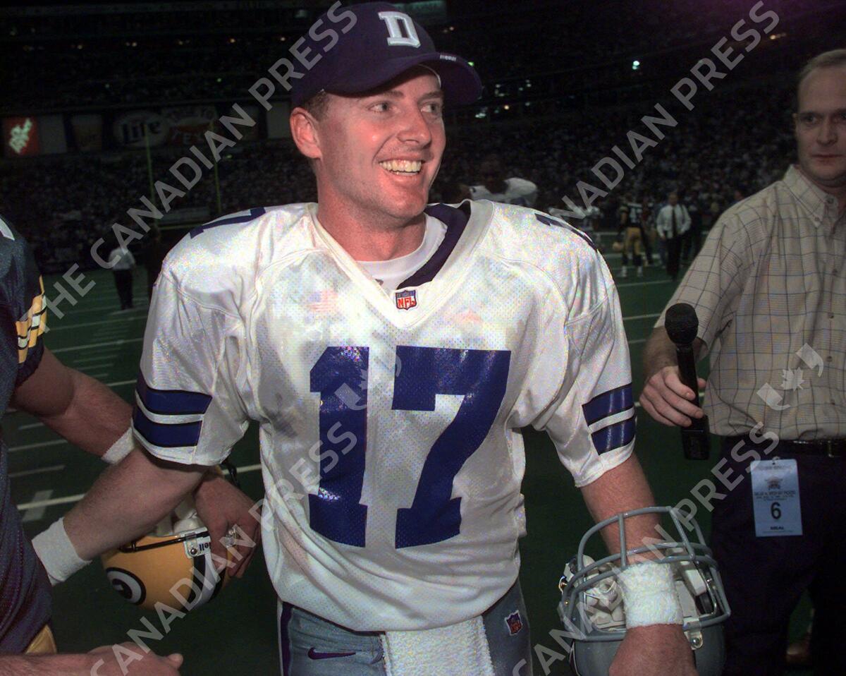 ** FILE ** Dallas Cowboys quarterback Jason Garrett smiles as he walks off the field after the Cowboys beat the Green Bay Packers on Sunday, Nov. l4, 1999, in Irving, Texas. The Cowboys added Garrett to their coaching staff Thursday night, Jan. 25, 2007, and said he would remain a candidate to replace retired head coach Bill Parcells. (AP Photo/L. M. Otero,file)