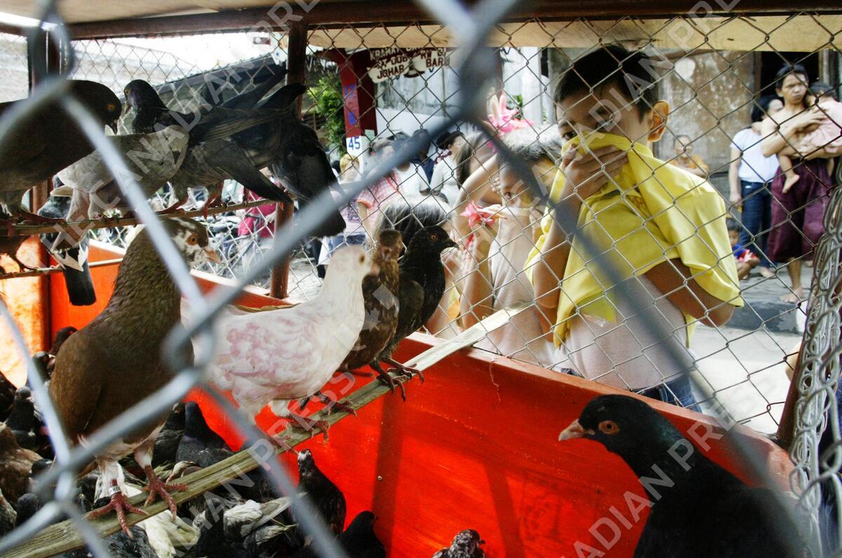 Indonesian children look at pigeons for sale Friday Jan. 26, 2007, in Jakarta, Indonesia. Another bird flu death was announced Thursday by officials amidst renewed efforts to rid the capital of "backyard birds" living in close proximity to humans.(AP Photo/Tatan Syuflana)