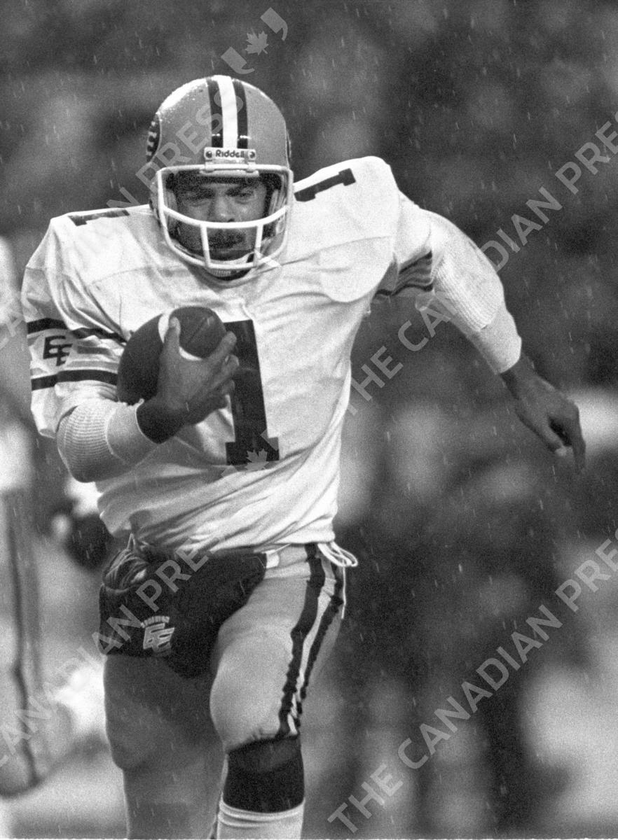 Edmonton quarterback Warren Moon runs the ball Nov 28, 1982 during Crey Cup action. Moon won the Most Outstanding Offensive player of the game. THE CANADIAN PRESS/Gary Hershorn