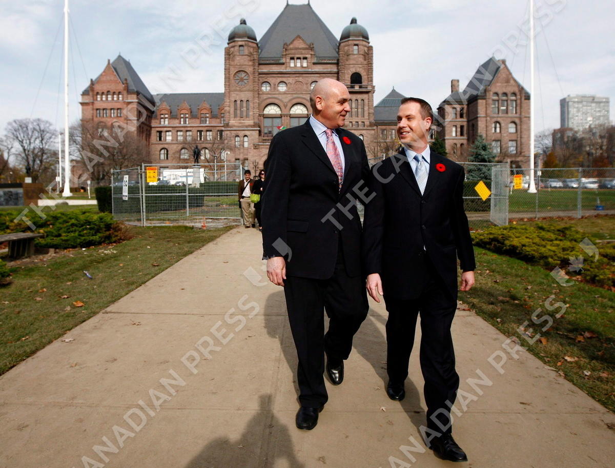 George Smitherman, left, and his partner Christopher Peloso, right, leave Queens's Park after Smitherman confirmed that he will resign as Ontario Deputy Premier and Minister of Energy and Infrastructure to offically run for mayor of Toronto on Monday, Nov. 9, 2009 in Toronto. THE CANADIAN PRESS/Nathan Denette
