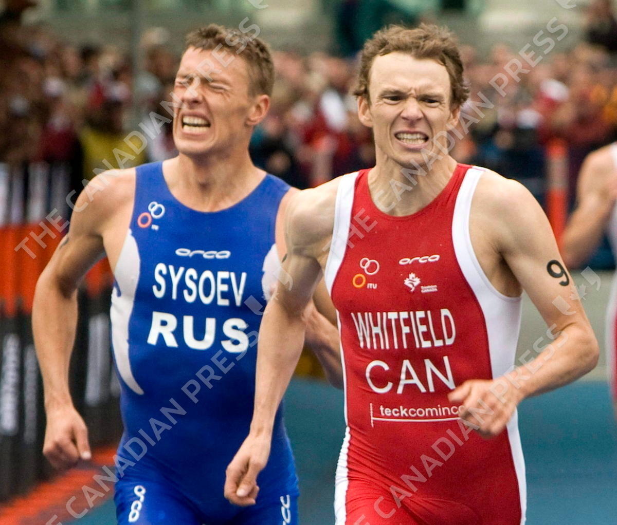 FILE--Canada's Simon Whitfield, right, races Igor Sysoev of Russia to the finish line during the Elite Men's World Triathlon in Vancouver, Sunday, June 8, 2008. Whitfield finished in sixth place. There have been changes in his sport and dramatic shifts in his person life, but a constant remains buried inside triathlete Whitfield. He wants to win a medal at this summer's Olympic Games in Beijing. The method of how he gets back on the podium may be different, but the desire remains the same. THE CANADIAN PRESS/Jonathan Hayward