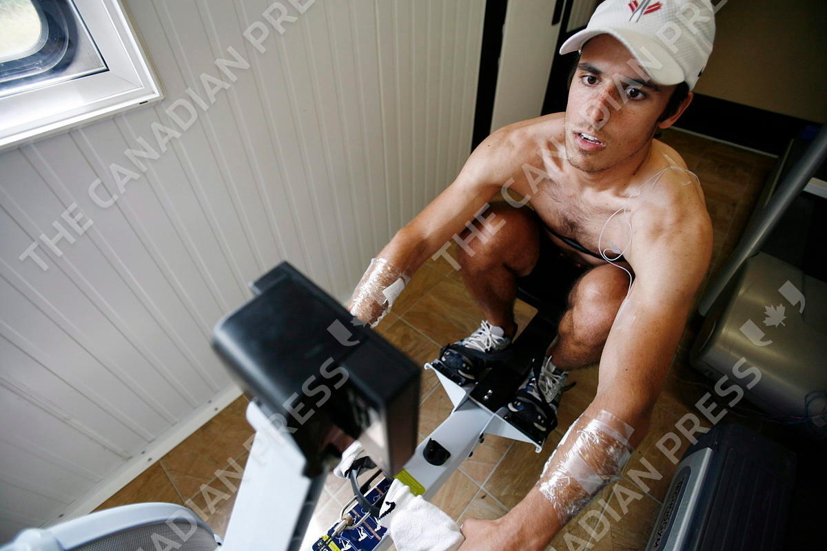 Rower Paul Amesbury,25, works out on a rowing machine inside the Canadian Sport Centre Pacific trailer as Liz Johnson, and exercise physiologist, records data such as skin and core body temperature, heart rate, etc, at Saanich Commonwealth Place in Victoria, BC, on June 23, 2008. THE CANADIAN PRESS/ Deddeda Stemler