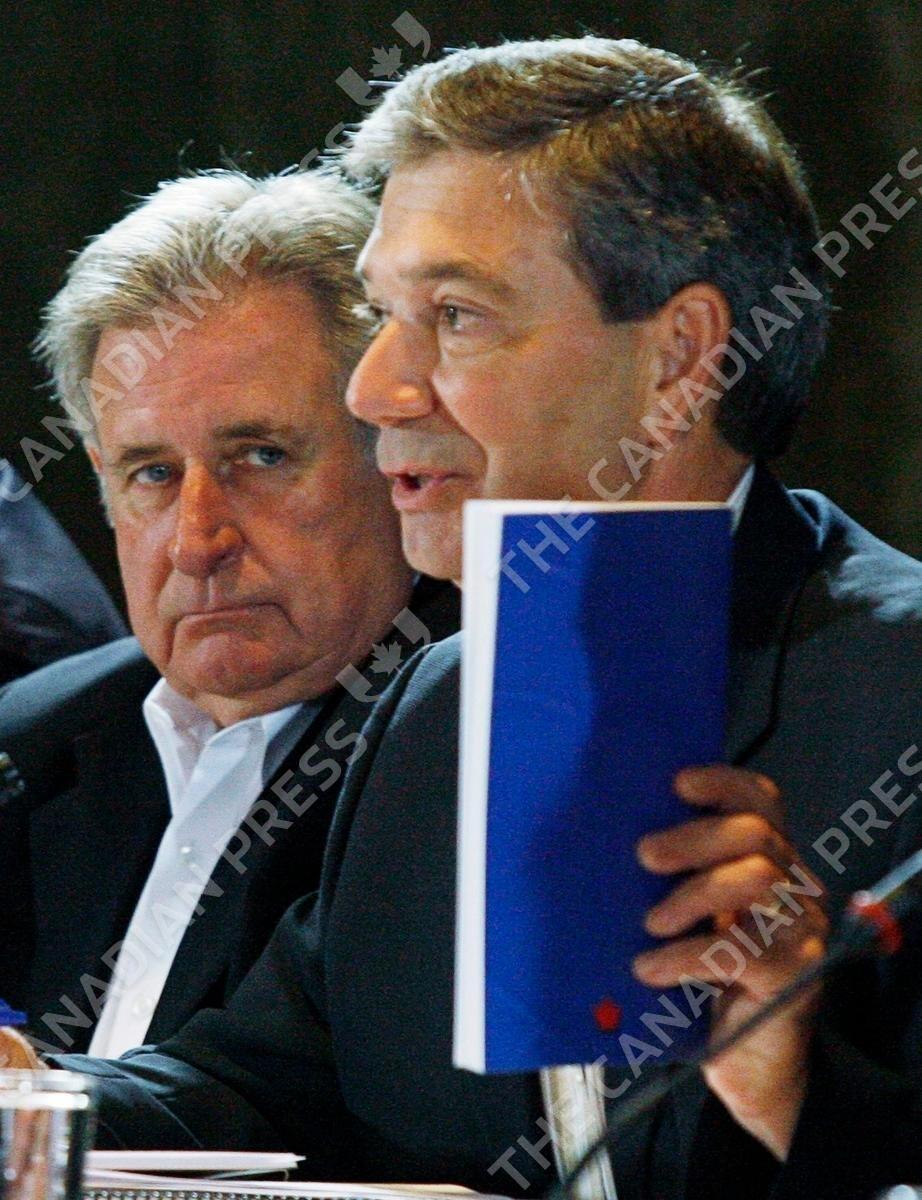 Alberta Premier Ralph Klein, left, looks on as Prince Edward Island Premier fields a question at the end of a meeting of the Council of the Federation in St. John's on Friday, July 28, 2006.(CP PHOTO/Andrew Vaughan)