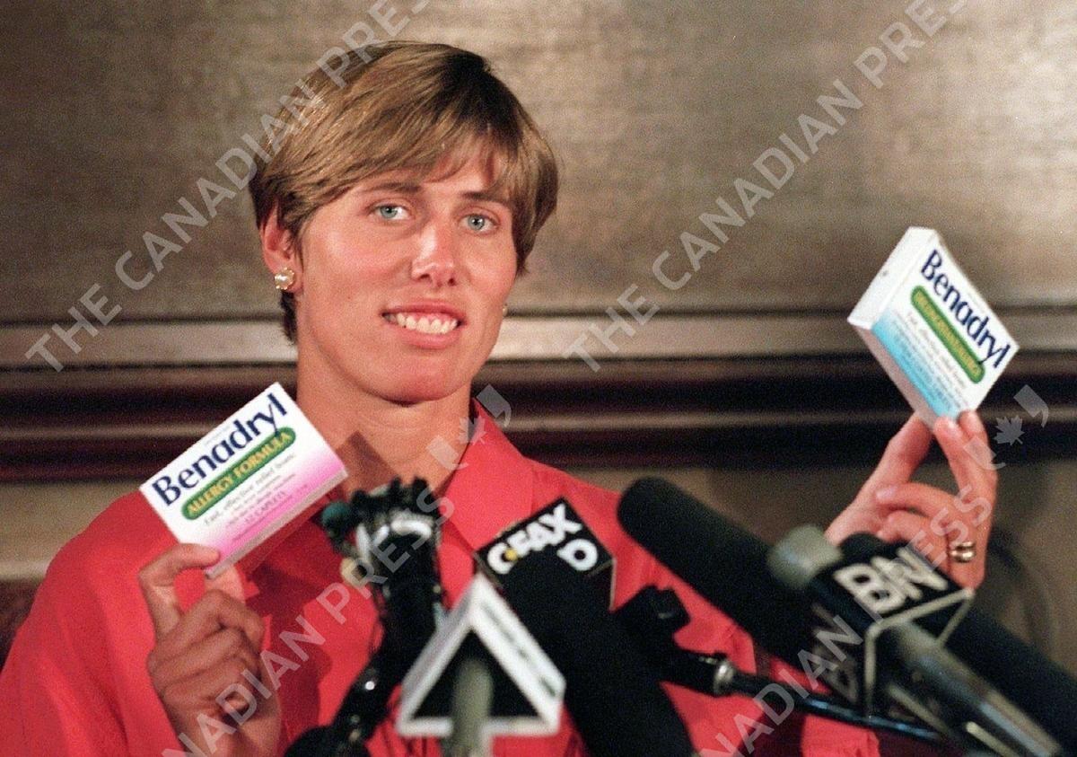 Canadian rower Silken Laumann puts on a brave face as she displays two medicines at a news conference in Victoria, Thursday, March 23, 1995. Laumann explained that she had taken the package of Benadryl shown left she would have passed the drug test at the Pan-Am Games. By mistake she purchesed and took a different type of the same brand name displayed right and tested positive for a banned stimulant. (CP PHOTO/Chuck Stoody)