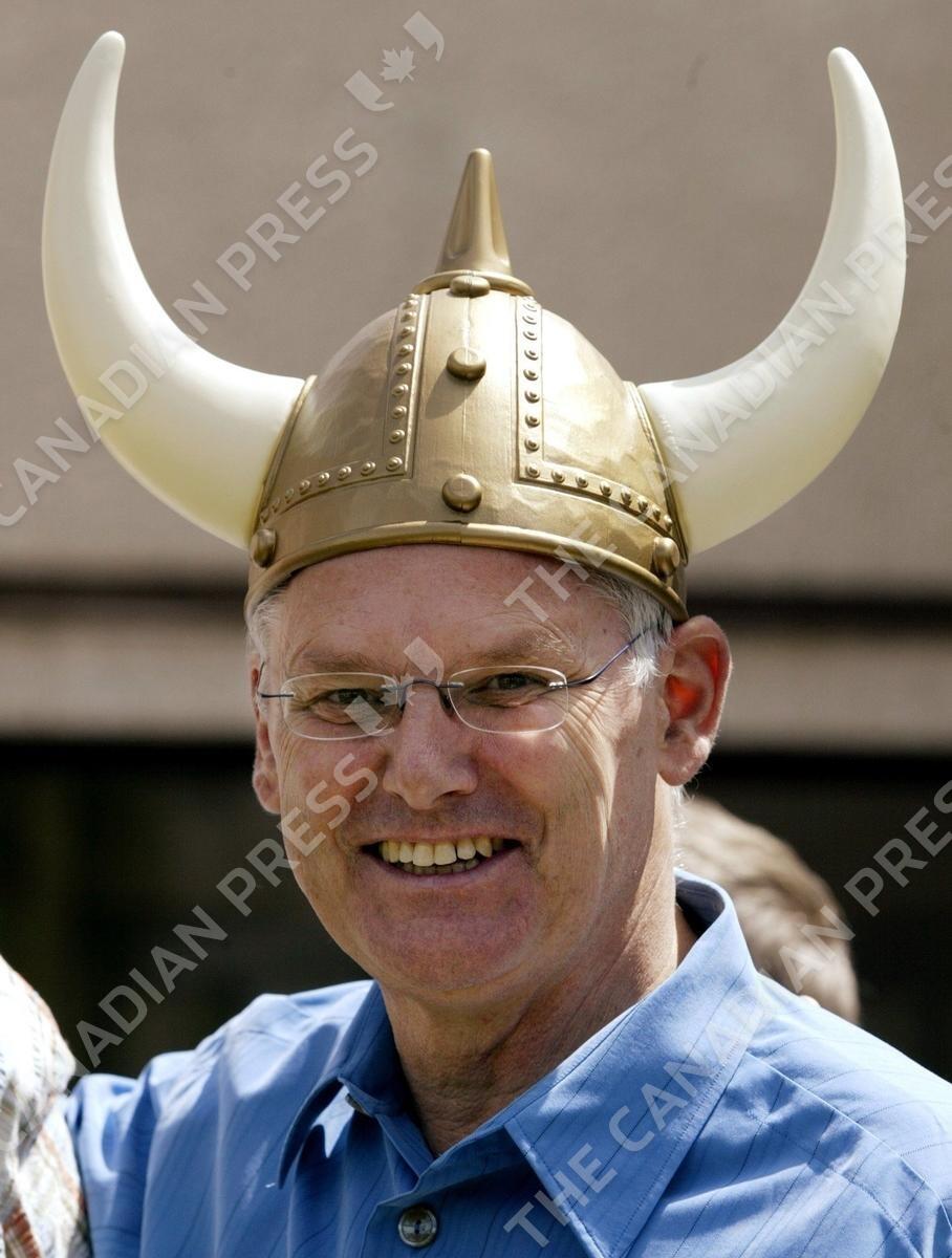 B.C. Premier Gordon Campbell models a novelty Icelandic helmut that he bought in Gimli, Man., Tuesday May 30, 2006 while on a break from meetings at the Western Premiers Conference. Gimli has the largest population of Icelanders in the world next to Iceland itself.(CP PHOTO/Chuck Stoody)