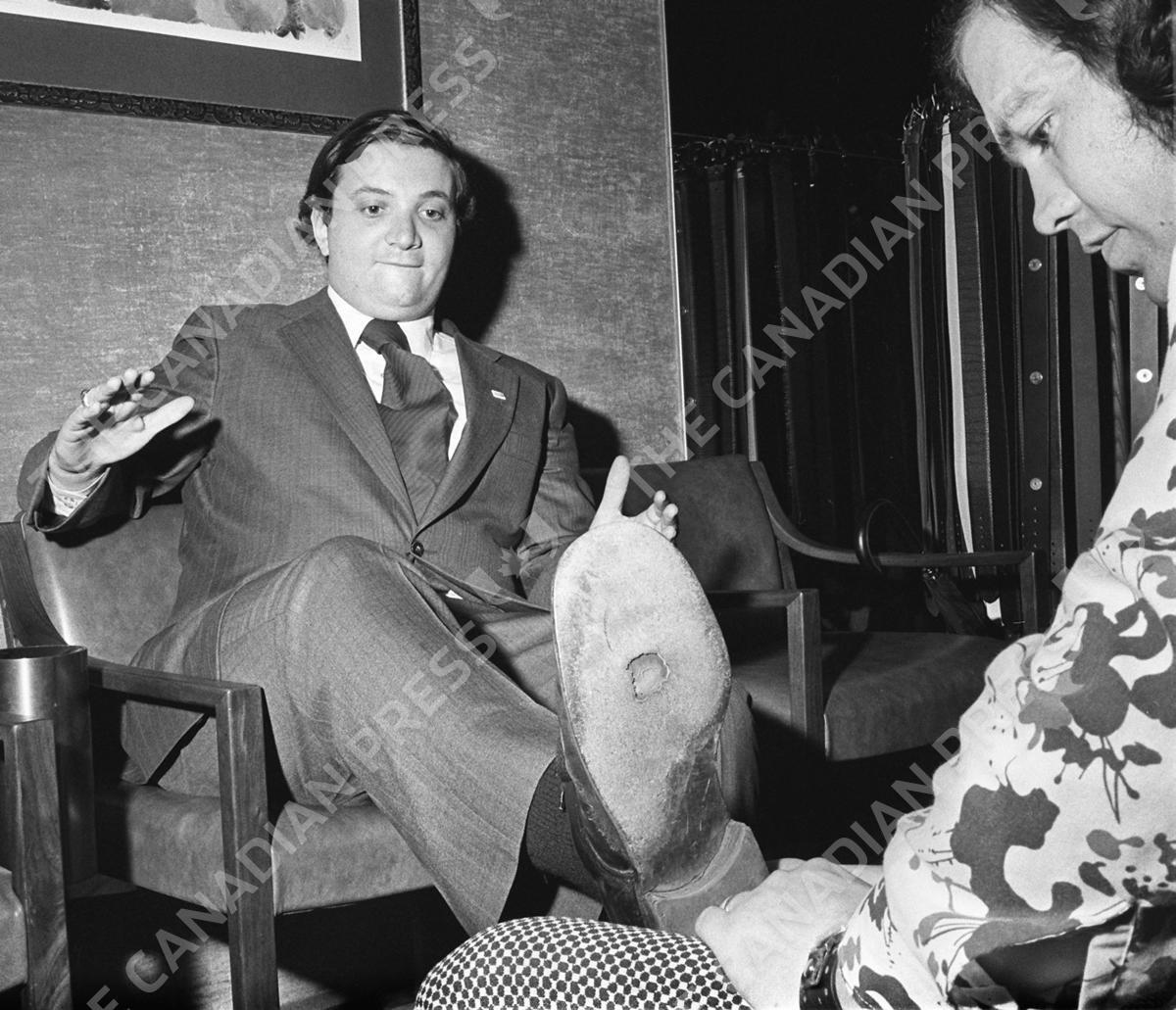 Hugh Segal, federal Progressive Conservative candidate in Ottawa Centre, settlea down in an Ottawa shoestore Wednesday May 17 1972, for a re-shoeing after canvassing 2500 homes in his riding since early March. (CP PHOTO/ Peter Bregg)