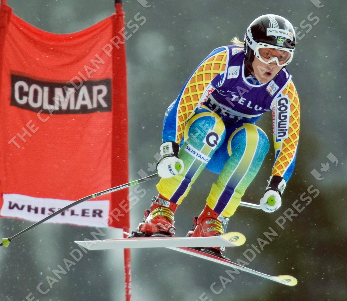 Anja Paerson of Sweden soars down the mountain on her way to placing sixth in the women's FIS World Cup downhill ski race in Whistler, B.C. on Friday Feb. 22, 2008. THE CANADIAN PRESS/Frank Gunn