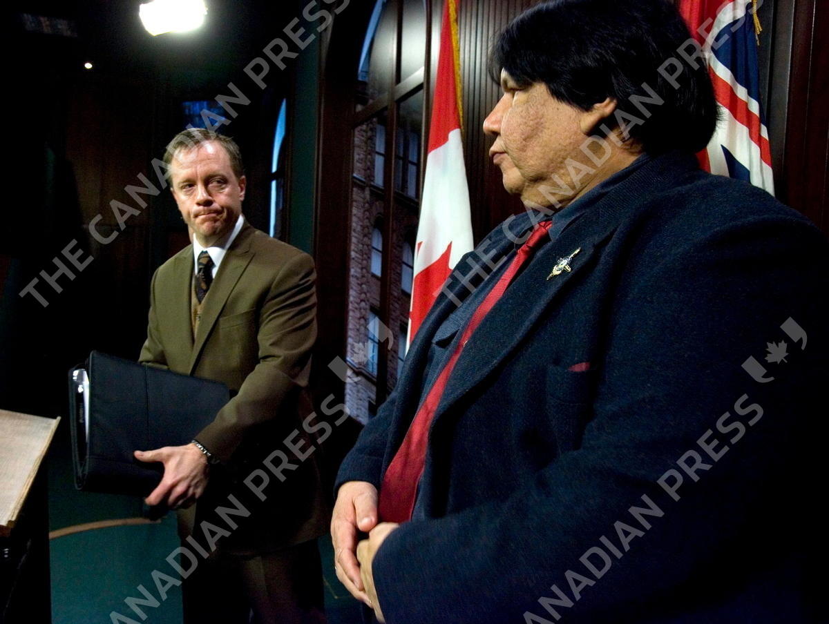 Aboriginal Affairs Minister Michael Bryant (left) looks overa at Chief Tom Bressette of Chippewas of Kettle and Stony Point First Nations during a news conference in Toronto on Thursday Dec. 20, 2007 to make an announcement on the Ipperwash Inquiry recommendations. THE CANADIAN PRESS/Frank Gunn