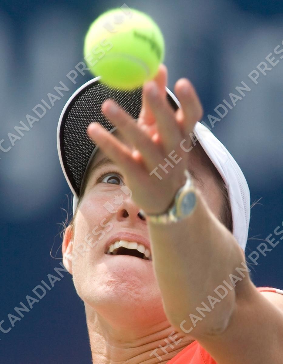 CORRECTS SPELLING OF FIRST NAME TO JUSTINE Justine Henin, from Belgium, serves against Shuai Peng, from China, during their match at the Rogers Cup in Toronto on Thursday Aug. 16, 2007. Henin won 7-5, 6-2. (CP PHOTO/Adrian Wyld) CANADA