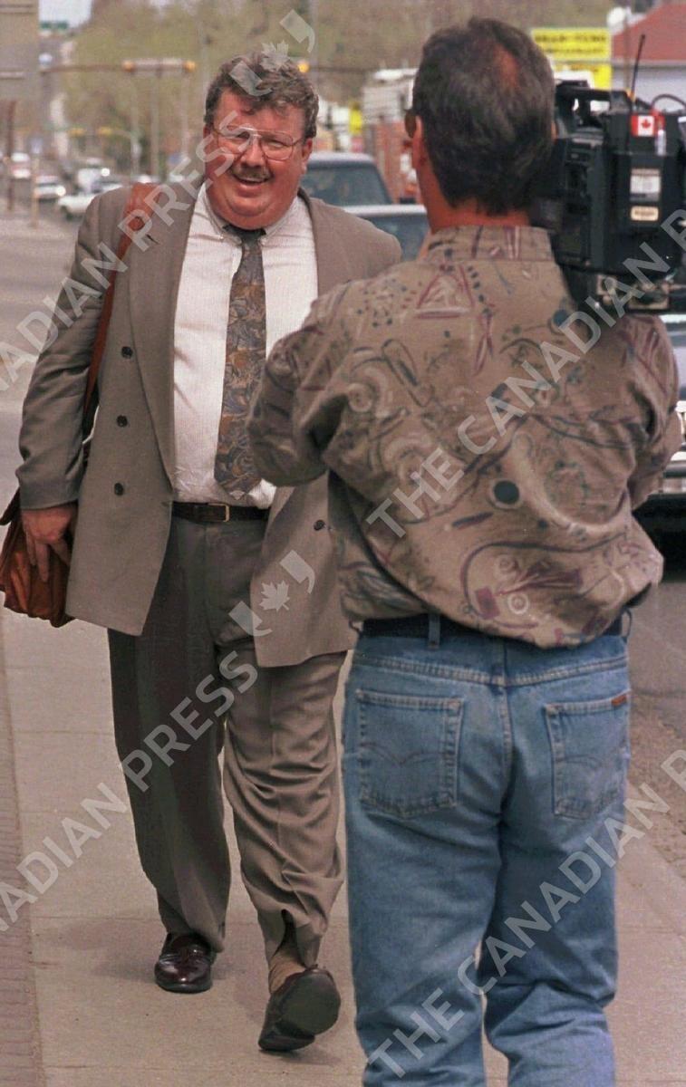 MAY 9--BRE-X INVESTIGATION--An unidentified accountant, left, is filmed by a CBC cameraman entering the Bre-X building in Calgary on Friday. The accounting firm of Price Waterhouse has been appointed by the Alberta Court of Queen's Bench to monitor the assests and records of the Bre-X group of companies. They have also been employed by Bre-X to investigate any fraud that may have been committed against Bre-X and its shareholders.(CP PHOTO) 1997 (str-Jeff McIntosh)jmc