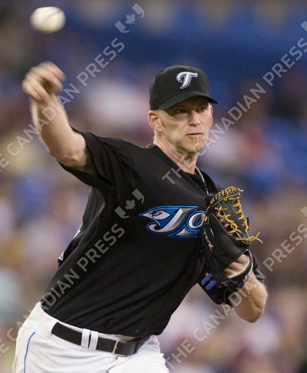 Toronto Blue Jays A.J. Burnett throws to first during action against the Atlanta Braves in interleague baseball action in Toronto, Sunday June 29, 2008. Burnett struck out a season high 11 batters over seven shutout innings to lead the Toronto Blue Jays to a 1-0 win over the Atlanta Braves. THE CANADIAN PRESS/Adrian Wyld